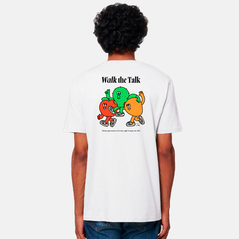 Designed in Barcelona and ethically made in Portugal in collaboration with Tiago Majuelos, the SAYE x Tiago T-Shirt highlights the innovative materials we’ve used for The Greens Capsule. It features playful depictions of a cactus, apple, and mango, representing our promise to #WalkTheTalk when it comes to eco-conscious accessories.